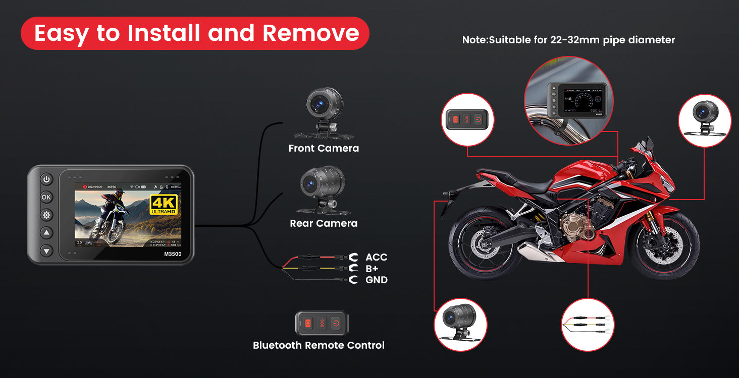 Loop recording will auto-overwrite the oldest video footage with the newest when the SD card is full to record continuously, never miss any crucial moment. M3500 motorbike camera supports up to 512GB SD card, Metorage 32G card default.